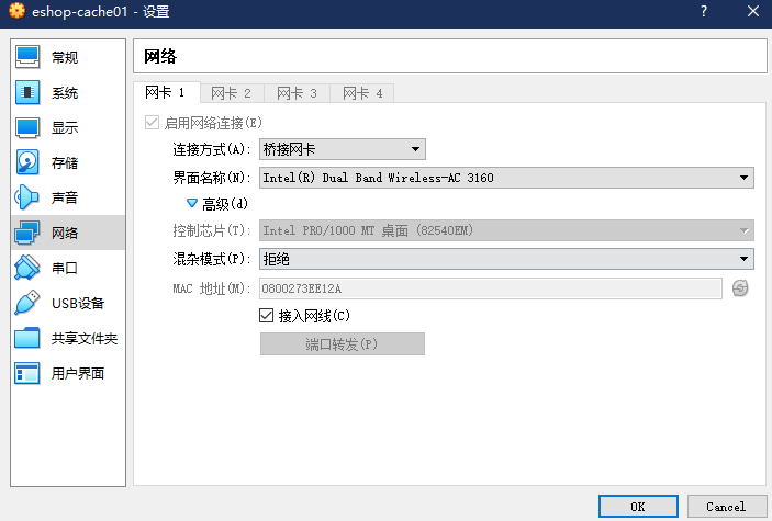 选择创建好的虚拟机,点击“设置”按钮,在网络一栏中,连接方式中,选择“Bridged Adapter” 桥接网卡。