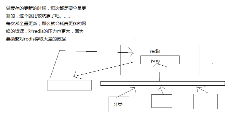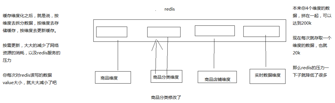 比如,现在只是将 1000 个商品的分类批量调整了一下,但是如果商品分类的数据和商品本身的数据混杂在一起,那么可能导致需要将包括商品在内的大缓存 value 取出来,进行更新,再写回去,就会很坑爹,耗费大量的资源,redis 压力也很大
