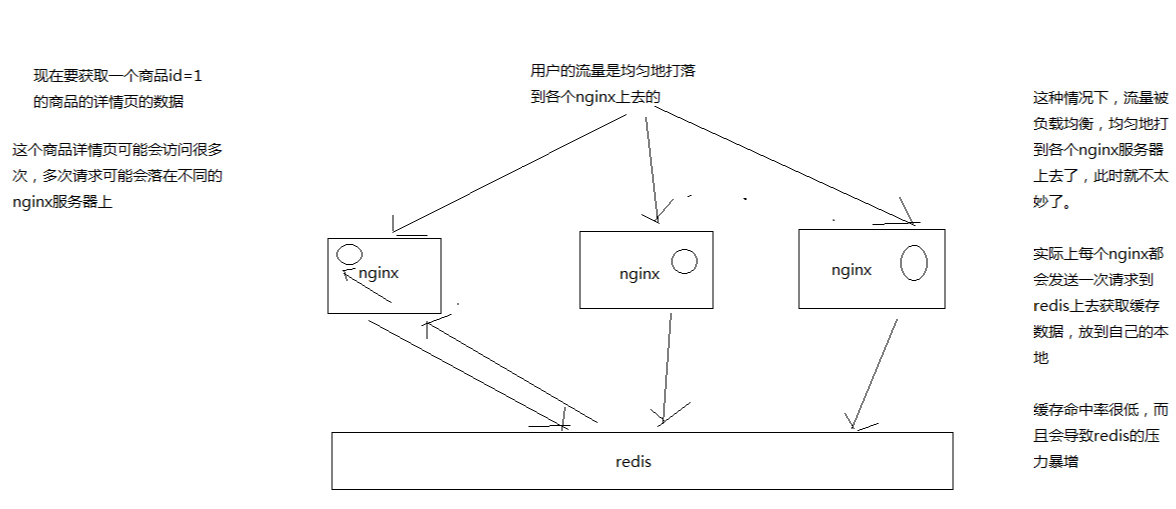 分发层 nginx,负责流量分发的逻辑和策略,这个里面它可以根据你自己定义的一些规则, 比如根据 productId 去进行 hash,然后对后端的 nginx 数量取模,将某一个商品的访问的请求, 就固定路由到一个 nginx 后端服务器上去,保证说只会从 redis 中获取一次缓存数据, 后面全都是走 nginx 本地缓存了