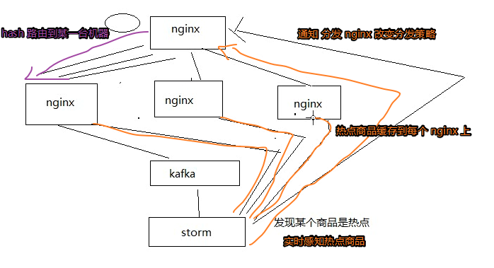 不能说长期的把这些商品缓存和流量降级策略长期保持,还需要 storm 进行计算感知, 如秒杀过后,该商品的访问量其实就降低到了普通商品访问量了, 这个时候就需要通知 nginx 取消降级和清楚该商品缓存