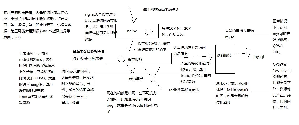 简单说:由于缓存不可用,导致大量请求访问后端服务,可能 mysql 扛不住高并发而打死, 像滚雪球一样,影响越来越大,最后导致整个网站崩溃不可用
