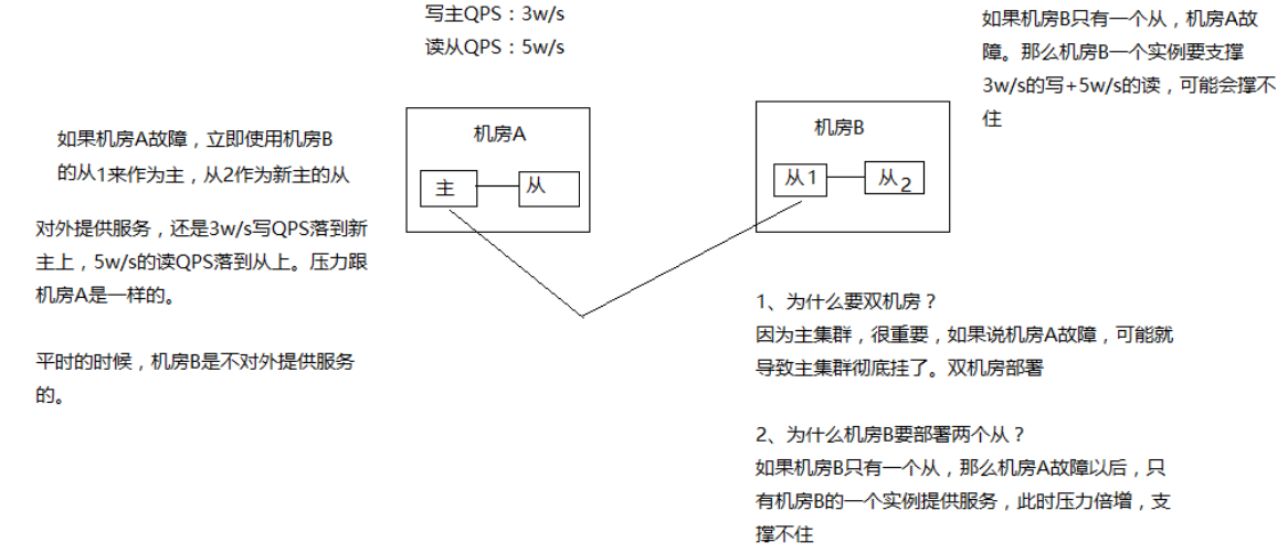 如果采取机房 A 部署一主一从,机房 B 一从,那么机房 A 故障时,机房 B 的一从承载所有读写压力,压力过大,很难承受