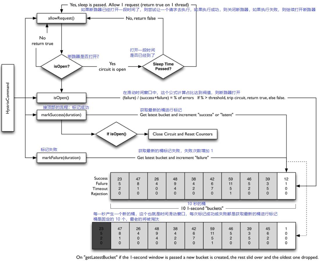 HystrixCommandProperties.circuitBreakerSleepWindowInMilliseconds()后下一个请求如果通过(这个时候是半开状态(half-open)),断路器则关闭; 如果下一个请求失败,那么断路器将变成 open 状态,继续等待该配置时间后,再次尝试半开状态;