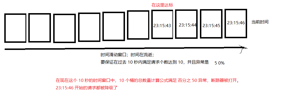对于测试代码来说,不太好控制,可能是没有理解那个 10 秒桶滑动时间窗口, 只能这种在短时间内产生大量请求,然后异常。