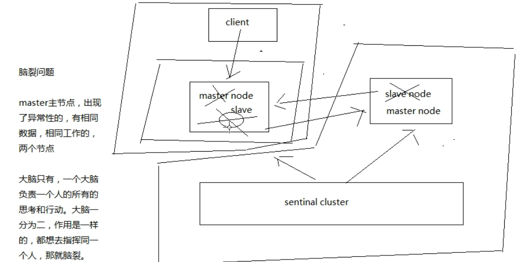 何为脑裂?如上图由于一个集群中的 master 恰好网络故障,导致与 sentinal 联系不上了,sentinal 把另一个 slave 提升为了 master。此时就存在两个 master了。