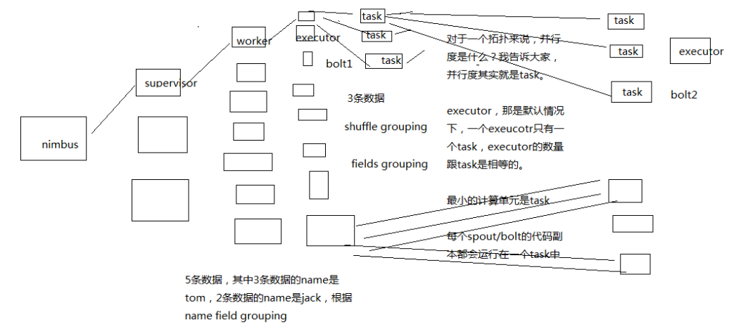 好多年前,我第一次接触 storm 的时候,真的我觉得都没几个人能彻底讲清楚,用一句话讲清楚什么是并行度,什么是流分组, 很多时候,你以外你明白了,其实你不明白,比如我经常面试一些做过 storm 的人过来,我就问一个问题, 就知道它的水深水浅,流分组的时候,数据在 storm 集群中的流向,你画一下,比如你自己随便设想一个拓扑结果出来, 几个 spout,几个 bolt,各种流分组情况下,数据是怎么流向的,要求具体画出集群架构中的流向, worker,executor,task,supervisor,数据是怎么流转的;几乎没几个人能画对,为什么呢, 很多人就没搞明白这个并行度和流分组到底是什么