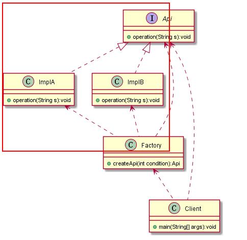 红框代表一个封装体,完全在红框中的为封装体内部的,工厂和接口暴露了一部分给外部。