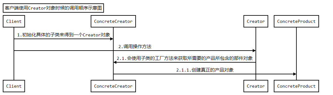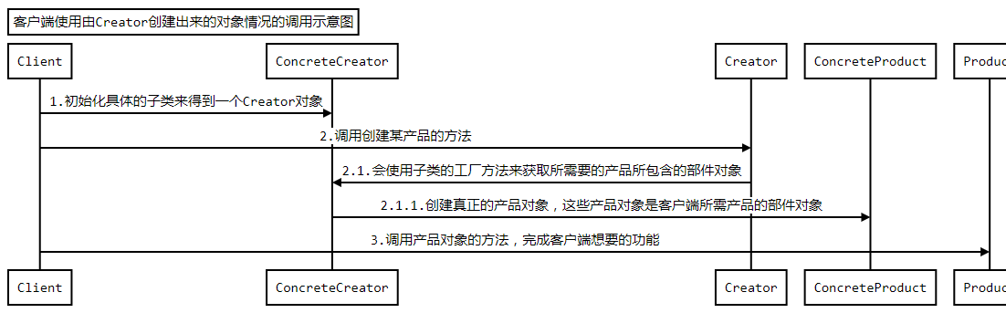 - ConcreteCreator: 具体的创建器对象,覆盖实现Creator定义的工厂方法,返回具体的Product实例
