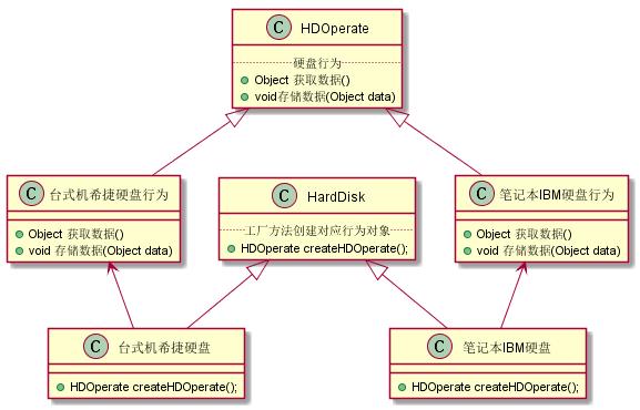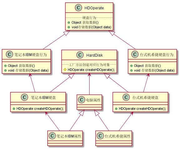 上面的示例图,在每个硬盘对象里面,都有一个工厂方法CreateHDOperate,通过这个工厂方法,客户端就可以获取一个根硬盘对象相对应的行为对象。