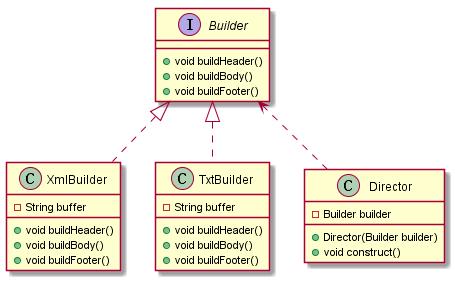 - ConcreteBuilder:具体的生成器实现,实现各个部件的创建,并负责组装 Product 对象的各个部件,同时还提供一个让用户获取组装完成后的产品对象的方法。