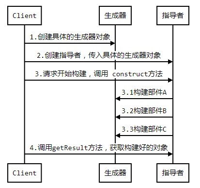 - Director:指导者,也被称为导向者,主要用来使用 Builder 接口,以一个统一的过程来构建所需要的 Product 对象。(构建过程)