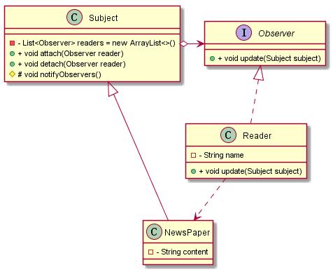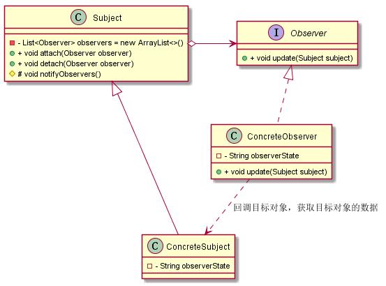 Observer: 定义观察者的接口,提供目标通知时对应的更新方法,这个更新方法进行相应的业务 ,可以在这个方法里面回调目标对象,以获取目标对象的数据。 ConcreteSubject: 具体的目标实现对象,用来维护目标状态,当目标对象的状态发生该表时,通知所有注册有效的观察者,让观察者执行相应的处理。 ConcreteObserver: 观察者的具体实现对象,用来接收目标的通知,并进行相应的后续处理,比如更新自身的状态以保持和目标的相应状态一致。
