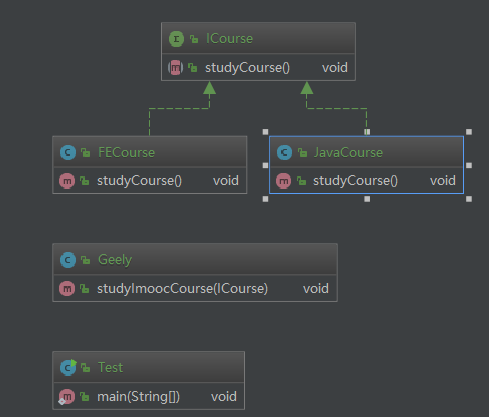 现在的问题是:如果要再增加一门学习课程呢?那么解决的方案只能在 Geely 类中增加另外一门课程的方法,然后Test(应用层)再调用该方法